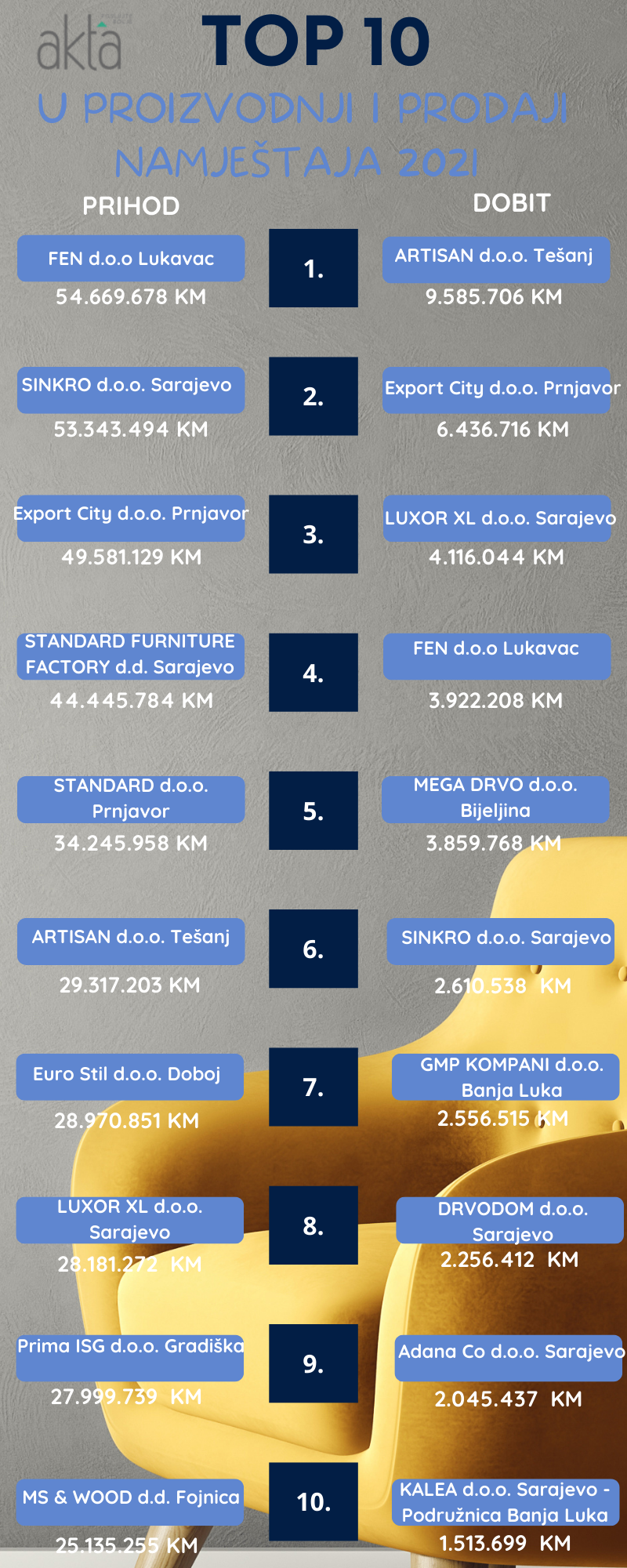 U tradicionalnoj godišnjoj Akta.ba analizi kompanija ovog sektora, među top 10 nema velikih promjena. Pojedine kompanije su ostvarile rast prihoda i dobiti, a na prvom mjesto po ostvarenoj dobiti nalazi se tešanjski Artisan koji je ostvario rekordnih 9,5 miliona KM.