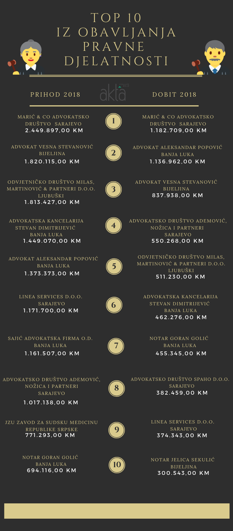 TOP deset društava BiH koja obavljaju pravnu djelatnost – Poslovni portal Akta.ba uradio je analizu top 10 društava i ureda po ostvarenom prihodu i dobiti u 2018. godini a koji obavljaju pravne djelatnosti na području BiH.