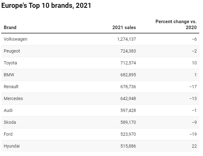 Marka Volkswagen ostala je prva marka u Evropi, ali njena prodaja u 2021. pala je 6,2 posto na 1.274.137. Peugeot je zauzeo drugo mjesto s padom od 2,3 posto na 724.383. To je bilo samo oko 12.000 više od trećeplasirane Toyote.