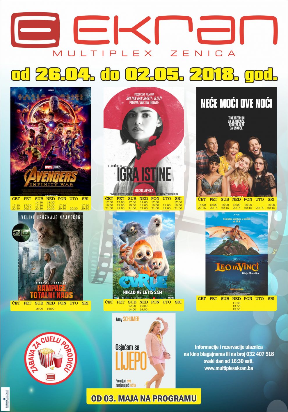 Tri nova filma od 26. aprila u programu Multiplex Ekran Zenica – Od četvrtka 26. aprila u Multiplexu Ekran ne propustite marvelovo neviđeno filmsko putovanje “OSVETNICI: RAT BESKONAČNOSTI (3D)”, horor triler koji će vas ostaviti bez daha “IGRA ISTINE” i animiranu avanturu za najmlađe “CVRLE NIKAD NE LETIŠ SAM (3D)”