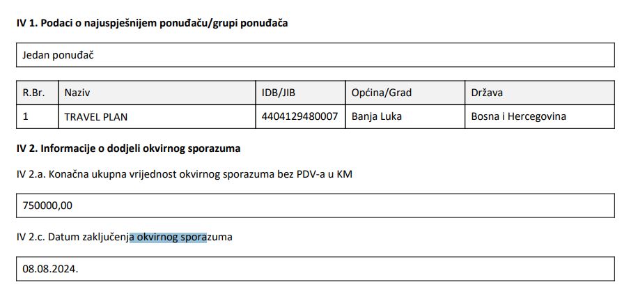 Jasno je to iz okvirnog sporazuma koji je ova državna institucija sklopila 8. avgusta sa agencijom Travel Plan iz Banjaluke, prenosi Interview.ba.