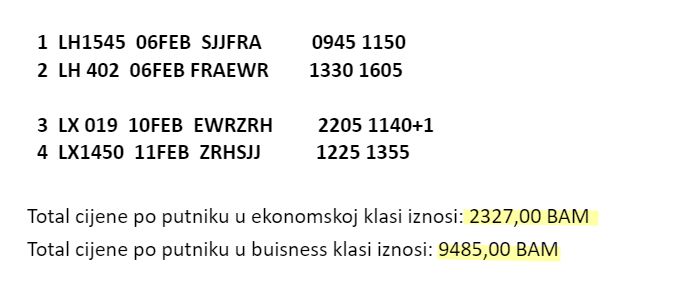 Trenutna cijena povratne karte za biznis klasu do New Yorka iznosi 9.485 maraka, a za ekonomsku klasu 2.327 KM.