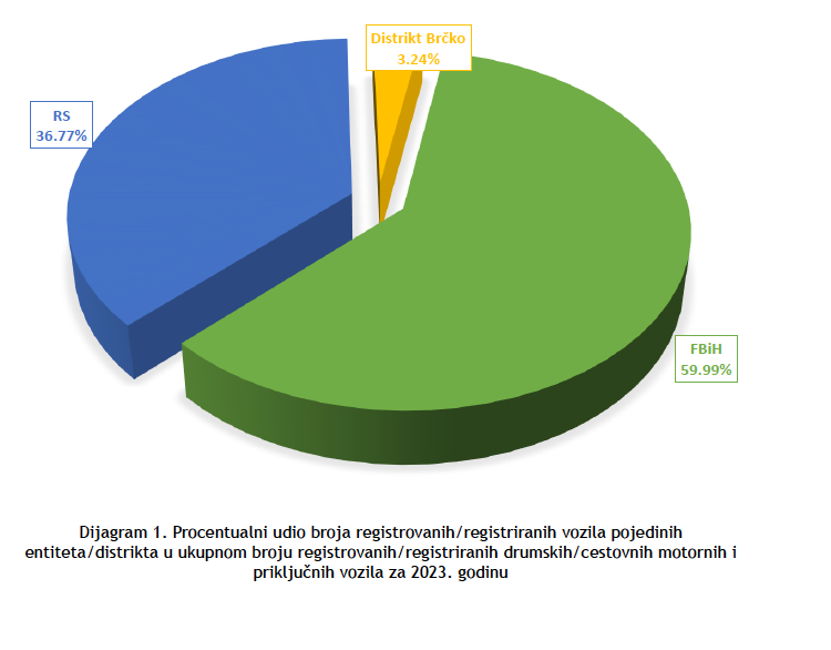 Na dijagramu 1. dat je prikaz procentualnog udjela broja registrovanih/registriranih vozila po entitetima/distriktu u ukupnom broju registrovanih/registriranih drumskih/cestovnih motornih i priključnih vozila u BiH za proteklu 2023. godinu.