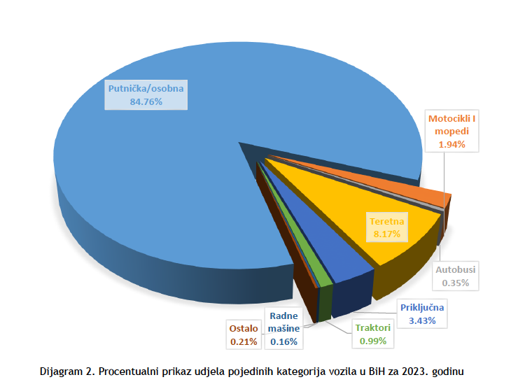 Tokom 2023. godine u Bosni i Hercegovini registrovano/registrirano je 17.096 novih drumskih/cestovnih vozila, od toga je 7.479 prodatih novih putničkih/osobnih vozila ili oko 43,75%, odnosno 8.574 putničkih i privrednih vozila1 što čini oko 50,15% od ukupnog broja prodatih novih vozila proizvedenih 2023 godine.