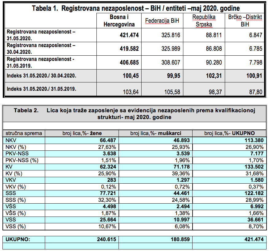 U BiH 421.474 nezaposlena lica – Pregled registrovane nezaposlenosti na evidencijama zavoda i službi zapošljavanja u Bosni i Hercegovini – maj 2020. godine.