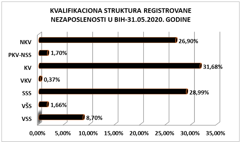 Najveći broj evidentirane nezaposlenosti čine lica sa trećim stepenom obrazovanja KV radnici 31,68%, zatim radnici sa SSS28,99%, te NKV radnici 26,90%.