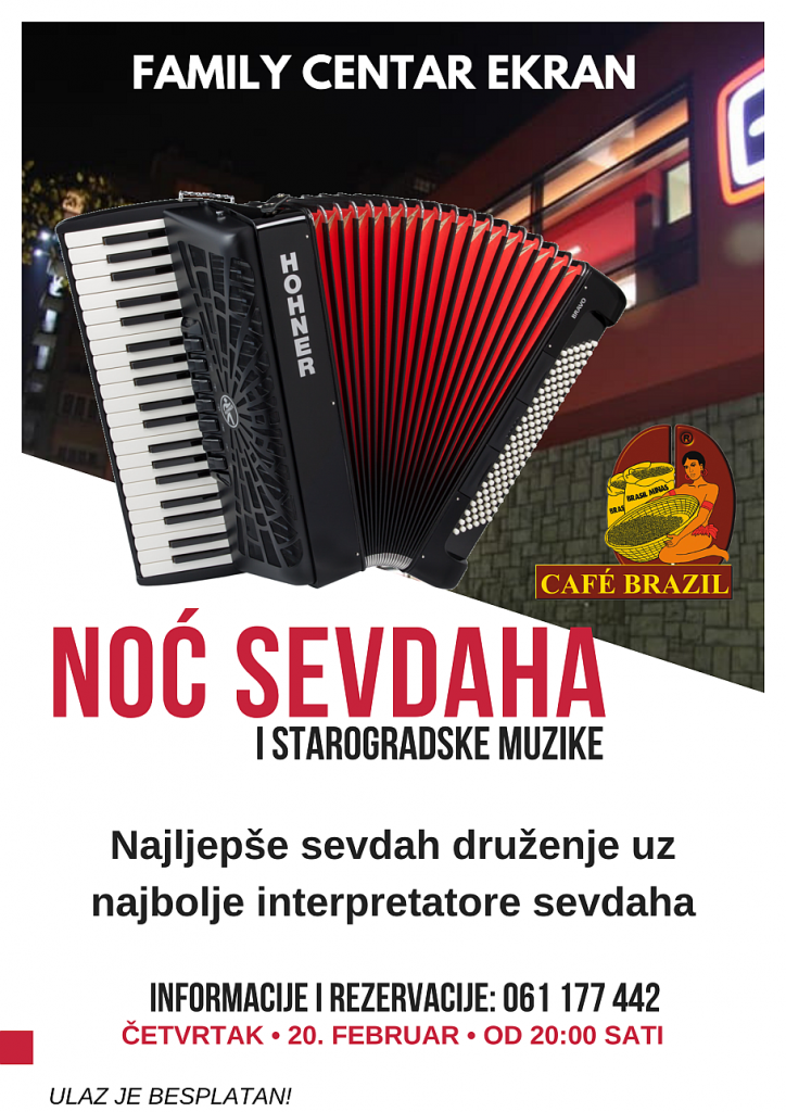 Naime, u četvrtak, 20. februara u restoranskom prostoru Centra Ekran održat će se druga ovosezonska Noć sevdaha i starogradske muzike. Publici Centra Ekran će se po prvi put predstaviti Zeničke meraklije sa svima poznatim sevdah i starogradskim repertoarom, ali i interpretatorke sevdaha Safija Vučenović i Mirsada Mekić, u čijim interpretacija je publika Family Centra Ekran uživala cijelu prošlu sezonu.