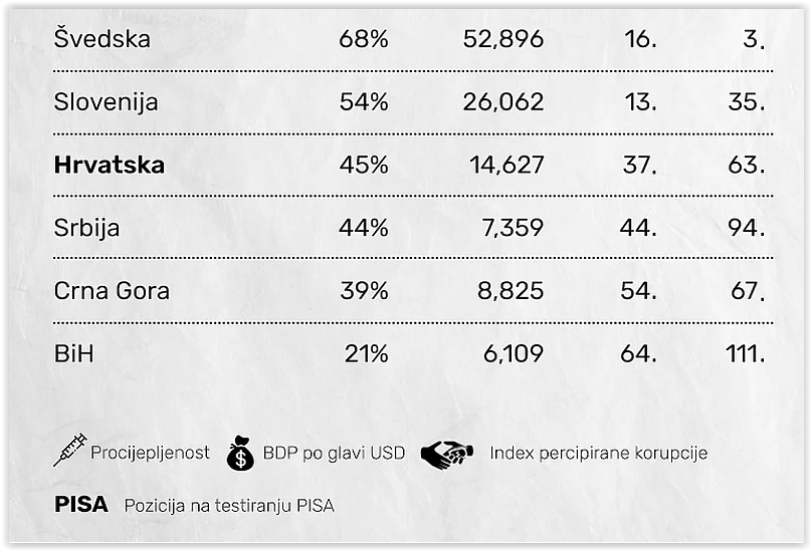 U Hrvatskoj je 45 posto potpuno vakcinisanih. Ima BDP po glavi stanovnika od 14.000 dolara, 37. je u PISA istraživanju i 63. po indeksu korupcije;