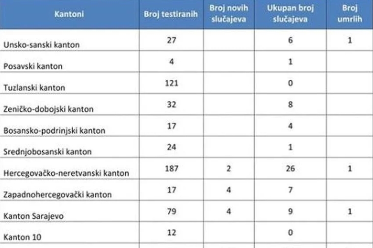U posljednja 24 sata zabilježeno je 10 novih slučajeva, po četiri u ZHK i Kantonu Sarajevo te dva u HNK. Pogledajte detaljnu tabelu s brojem zaraženih i novozaraženih, umrlih te testiranih u FBiH.