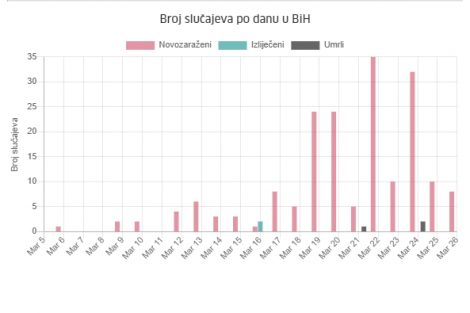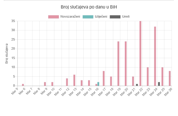 Testirano je 520 osoba, utvrđeno je 10 novih slučajeva, a ukupno 62 zaraženih je u FBiH. Od posljedica zaraze ovim virusom umrle su tri osobe, po jedna u Bihaću, Mostaru i Sarajevu.