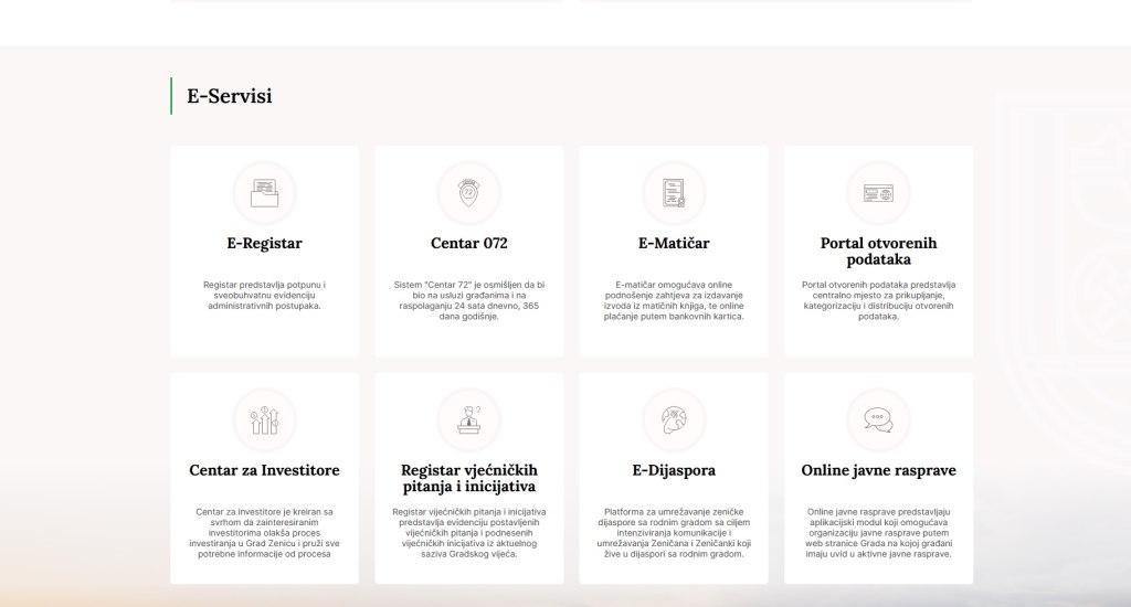 “Osim toga, važno je istaći kako je akcenat prilikom izrade nove WEB stranice bio na E-servisima, a koji će donijeti velike olakšice za sve naše građane. Naime, od sada je u funkciji unaprijeđeni E-matičar gdje će građani online moći podnijeti zahtjev za izdavanje izvoda iz matičnih knjiga, odabrati da li žele da im se izvod dostavi putem pošte na kućnu adresu ili će preuzimanje izvršiti na info-pultu Gradske uprave i na kraju izvršiti plaćanje putem kartice. Također, od sada će u funkciji biti i online javne rasprave, platforma za online pokretanje administrativnih postupaka, ali i brojne druge inovacije”, pojašnjava šef Sektora Zlotrg.