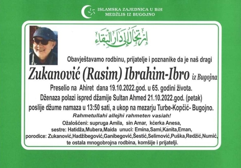 Dženaza će biti klanjana u petak (21. oktobar) u Bugojnu. Dženaza polazi ispred Sultan Ahmedove džamije u 13.50 sati poslije džuma-namaza, a ukop će biti obavljen na mezarju Turbe-Kopčić Bugojno.