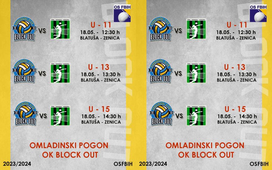 Utakmice se igraju u Sportskoj dvorani M.Ć.Ć. u Blatuši, u subotu 18.05.2024. godine, sa početkom u 12:30 sati.