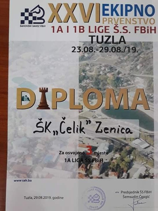 U Tuzli završena je Prva „A“ liga ŠSFBiH za 2019. – Ekipa ŠK Čelik osvojila treće mjesto – U Tuzli je odigrano 26. ekipno prvenstvo Šahovskog saveza FBiH za seniore, Prva „A“ liga za 2019.godinu, koje se igralo od 23.8. do 29.8.2019.godine u motelu Rudar.