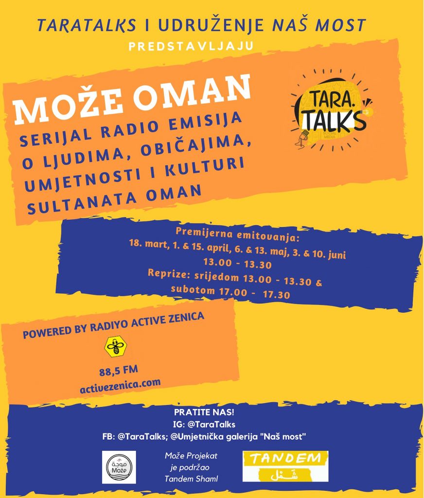 Partner na projektu je udruženje „Naša djeca“ Zenica, putem čije će community radio stanice „RadiYo Active“ biti emitovane radio emisije pod nazivom „Može Oman“ („Maujeh Oman“). Serijal „Može Oman“ će od 18. marta do 10. juna ove godine kroz sedam epizoda predstaviti različite aspekte kulture i tradicije Omana. „Cilj emisija ‘Može Oman’ je i probuditi interes kod mlađe publike za arapsku kulturu, te prebroditi međugeneracijski komunikacijski jaz na zabavan i interaktivan način”, kaže Tara Aldughaither, umjetnica, kuratorica, spisateljica i autorica „TaraTalks“.