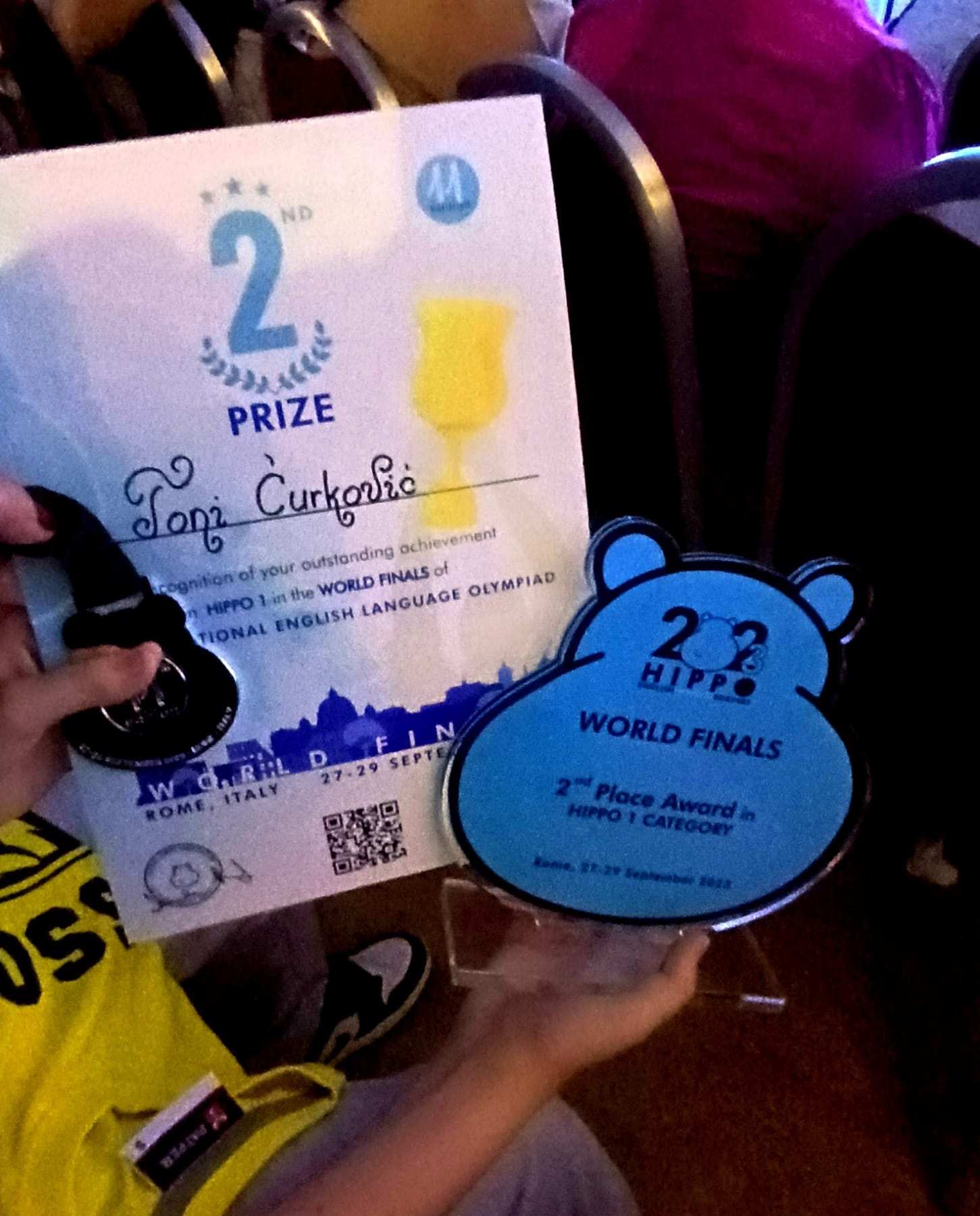 Učenik sedmoga razreda Osnovne škole Katoličkog školskog centra „Sveti Pavao“ iz Zenice Toni Ćurković je proteklih dana boravio u Rimu, u pratnji nastavnice Line Softić i sudjelovao na natjecanju svjetskih razmjera – 11th INTERNATIONAL HIPPO ENGLISH OLYMPIAD na kojem je osvojio visoko 2. mjesto i srebrnu medalju.