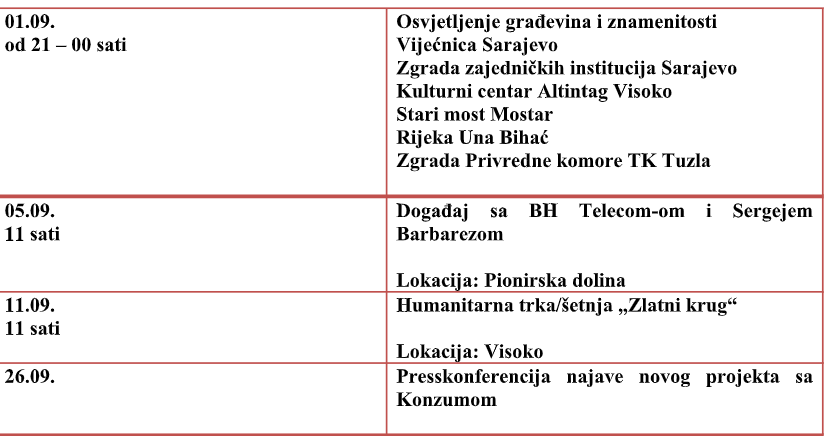 Kampanju smo započeli na simboličan način, tj.osvjetljenjem značajnih građevina i znamenitosti u Bosni i Hercegovini. Ovogodišnjoj kampanji podizanja svijesti poseban štih dali su gradovi Sarajevo, Visoko, Tuzla, Mostar, Bihać i Tešanj, koji su obojeni u zlatno i ogrnuti zlatnom vrpcom u znak podrške djeci oboljeloj i liječenoj od raka dočekali septembar. Od građevina i znamenitosti zlatne su postale Sarajevo – Vijećnica i Zgrada institucija BiH, Visoko – Kulturni centar Altindag, Mostar – Stari Most, Bihać – rijeka Una, Tuzla – zgrada Privredne komore TK i Tešanj – Tvrđava.