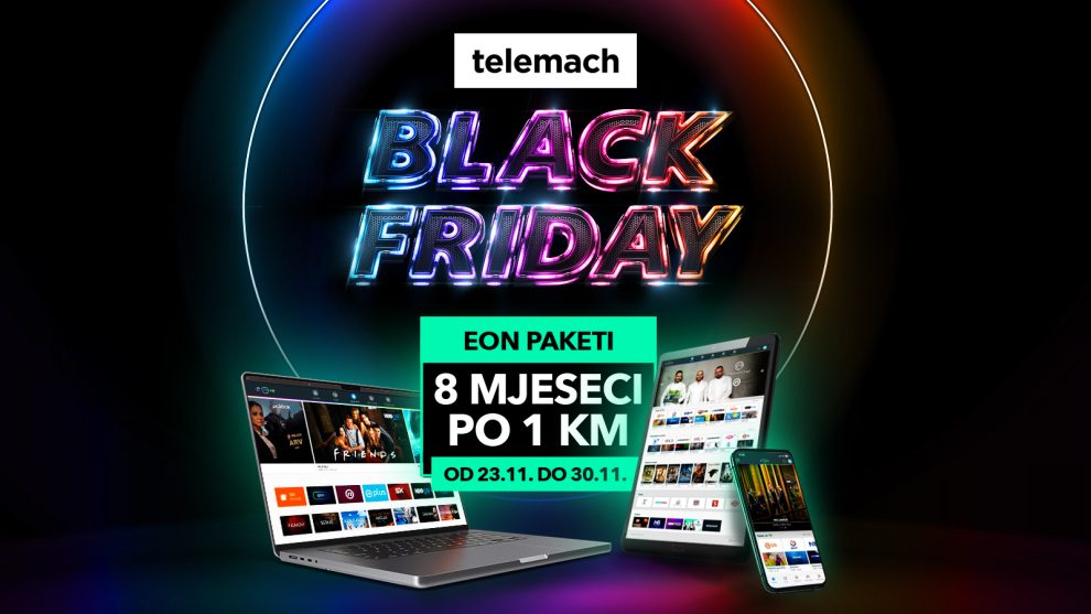 Najiščekivaniji shopping događaj godine Telemach obilježava specijalnom Black Friday akcijom EON paketa koja će biti dostupna samo sedam dana, od 23. do 30. novembra 2023. godine. Ugrabite svoj EON paket uz koji možete surfati brzinama do 500 Mbps, uživati u vrhunskom TV sadržaju i pozivima za 0 KM/min prema svim fiksnim mrežama unutar Bosne i Hercegovine, uz nevjerovatnu akcijsku ponudu – 8 mjeseci po 1KM mjesečno!