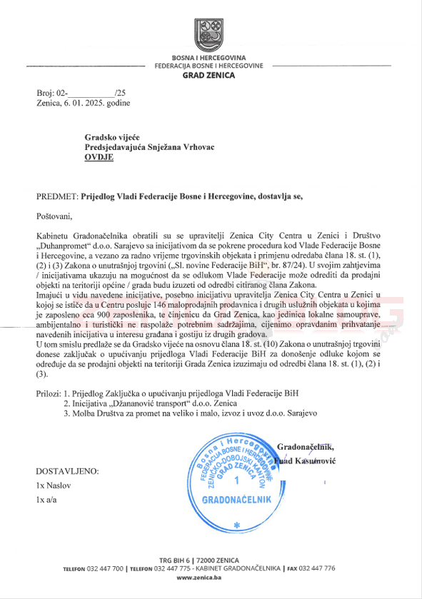 “Kabinetu Gradonačelnika obratili su se upravitelji Zenica City Centra u Zenici i Društvo „Duhanpromet” d.o.o. Sarajevo sa inicijativom da se pokrene procedura kod Vlade Federacije Bosne i Hercegovine, a vezano za radno vrijeme trgovinskih objekata i primjenu odredaba Zakona o unutrašnjoj trgovini. U svojim zahtjevima/inicijativama ukazuju na mogućnost da se odlukom Vlade Federacije može odrediti da prodajni objekti na teritoriji općine / grada budu izuzeti od odredbi citiranog člana Zakona. Imajući u vidu navedene inicijative, posebno inicijativu upravitelja Zenica City Centra u Zenici u kojoj se ističe da u Centru posluje 146 maloprodajnih prodavnica i drugih uslužnih objekata u kojima je zaposleno cca 900 zaposlenika, te činjenicu da Grad Zenica, kao jedinica lokalne samouprave, ambijentalno i turistički ne raspolaže potrebnim sadržajima, cijenimo opravdanim prihvatanje navedenih inicijativa u interesu građana i gostiju iz drugih gradova. U tom smislu predlaže se da Gradsko vijeće na osnovu člana 18. st. (10) Zakona o unutrašnjoj trgovini donese zaključak o upućivanju prijedloga Vladi Federacije BiH za donošenje odluke kojom se određuje da se prodajni objekti na teritoriji Grada Zenica izuzimaju od odredbi člana 18. st. (1), (2) i (3)” navedeno je u dostavljenom aktu gradonačelnika Kasumovića.