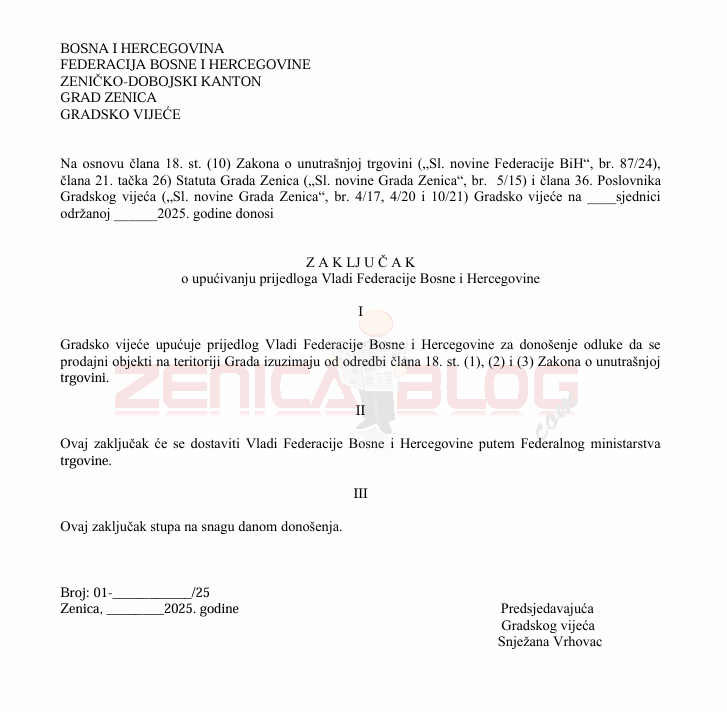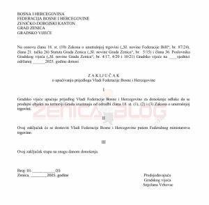 - Gradsko vijeće upućuje prijedlog Vladi Federacije Bosne i Hercegovine za donošenje odluke da se prodajni objekti na teritoriji Grada izuzimaju od odredbi člana 18. st. (1), (2) i (3) Zakona o unutrašnjoj trgovini.