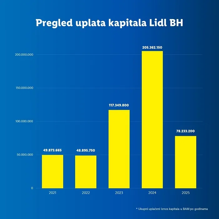 Njemačka kompanija Lidl do sada je uložila oko pola milijarde KM u razvoj i izgradnju svoje maloprodajne mreže u Bosni i Hercegovini.