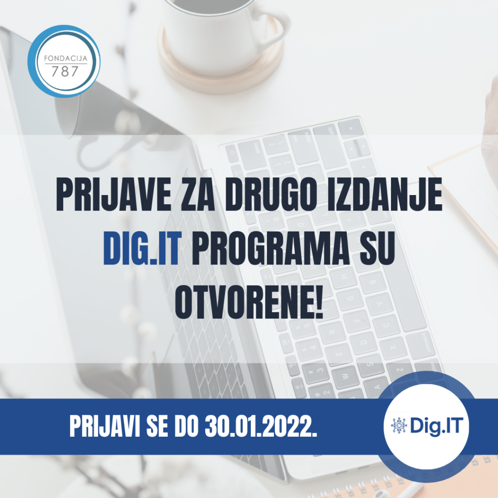 U periodu od februara 2022. do jula 2022. godine, Fondacija 787 uz podršku Američke ambasade u BiH implementira šestomjesečni program Dig.IT za preduzetnice iz cijele BiH. Program će okupiti 20 preduzetnica i žena koje imaju poslovnu ideju te rade na njenom daljem razvoju.