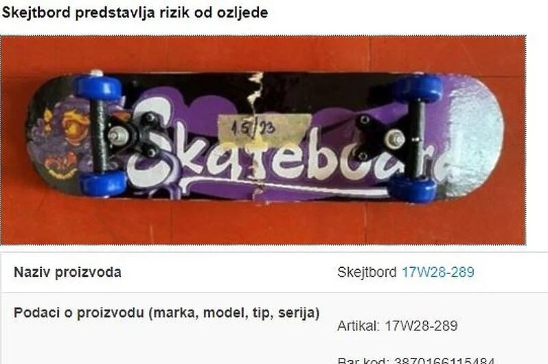 Sa tržišta Bosne i Hercegovine povučeno je i uništeno šest modela skateboarda u količini od 559 komada, jer su predstavljali ozbiljan rizik za potrošače, objavila je Agencija za nadzor nad tržištem BiH.