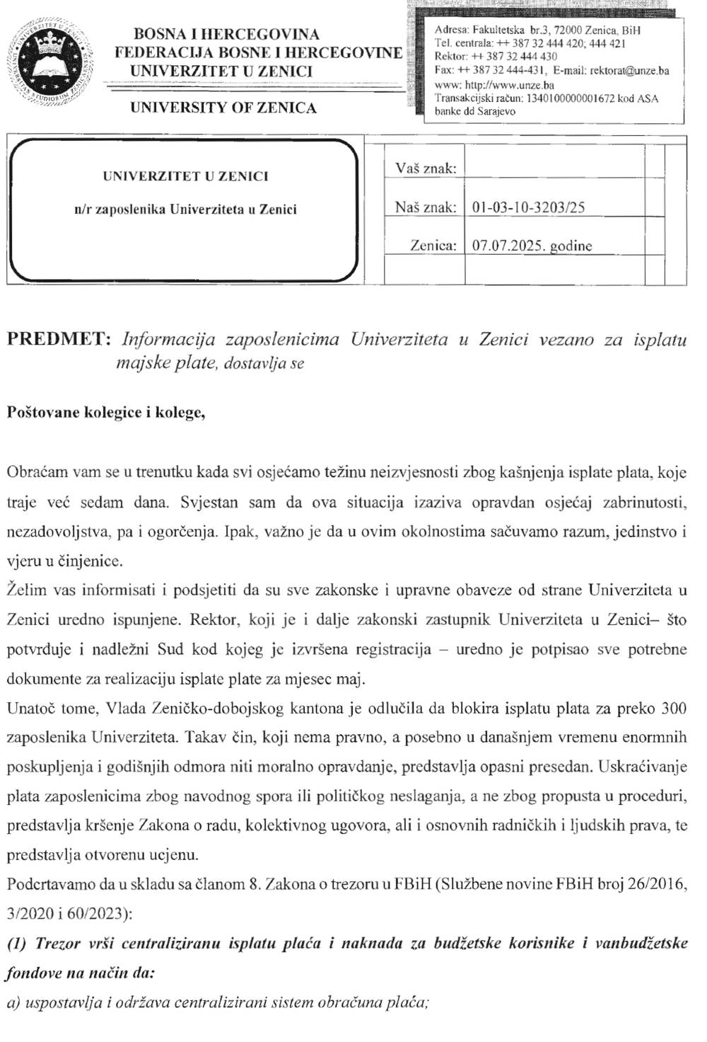 Obraćanje je naslvljeno kao “Informacija zaposlenicima Univerziteta u Zenici vezano za isplatu majske plate”, a u njemu Duraković navodi da “svi osjećamo težinu neizvjesnosti zbog kašnjenja isplate plata, koje traje već sedam dana. Svjestan sam da ova situacija izaziva opravdan osjećaj zabrinutosti, nezadovoljstva, pa i ogorčenja”