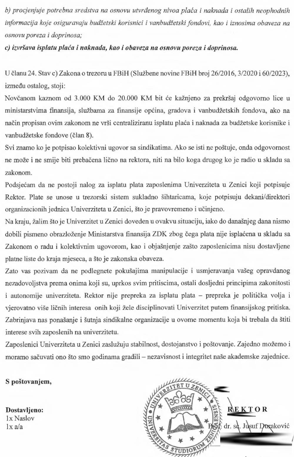 – Želim vas informisati i podsjetiti da su sve zakonske i upravne obaveze od strane Univerziteta u Zenici uredno ispunjene. Rektor, koji je i dalje zakonski zastupnik Univerziteta u Zenicišto potvrđuje i nadležni Sud kod kojeg je izvršena registracija — uredno je potpisao sve potrebne dokumente za realizaciju isplate plate za mjesec maj, kazao je Duraković u dopisu kojeg objavljujemo.