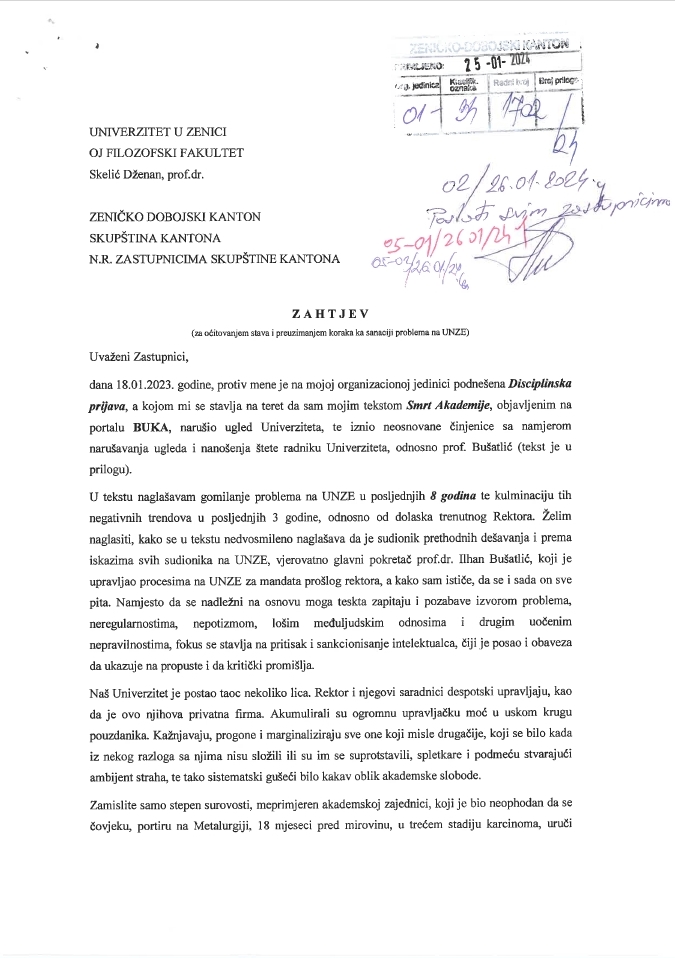 Početkom sedmice u medijima se pojavilo pismo koje je profesor Filozofskog fakulteta Univerziteta u Zenici Dženan Skelić uputio zastupnicima u Skupštini Zeničko-dobojskog kantona.