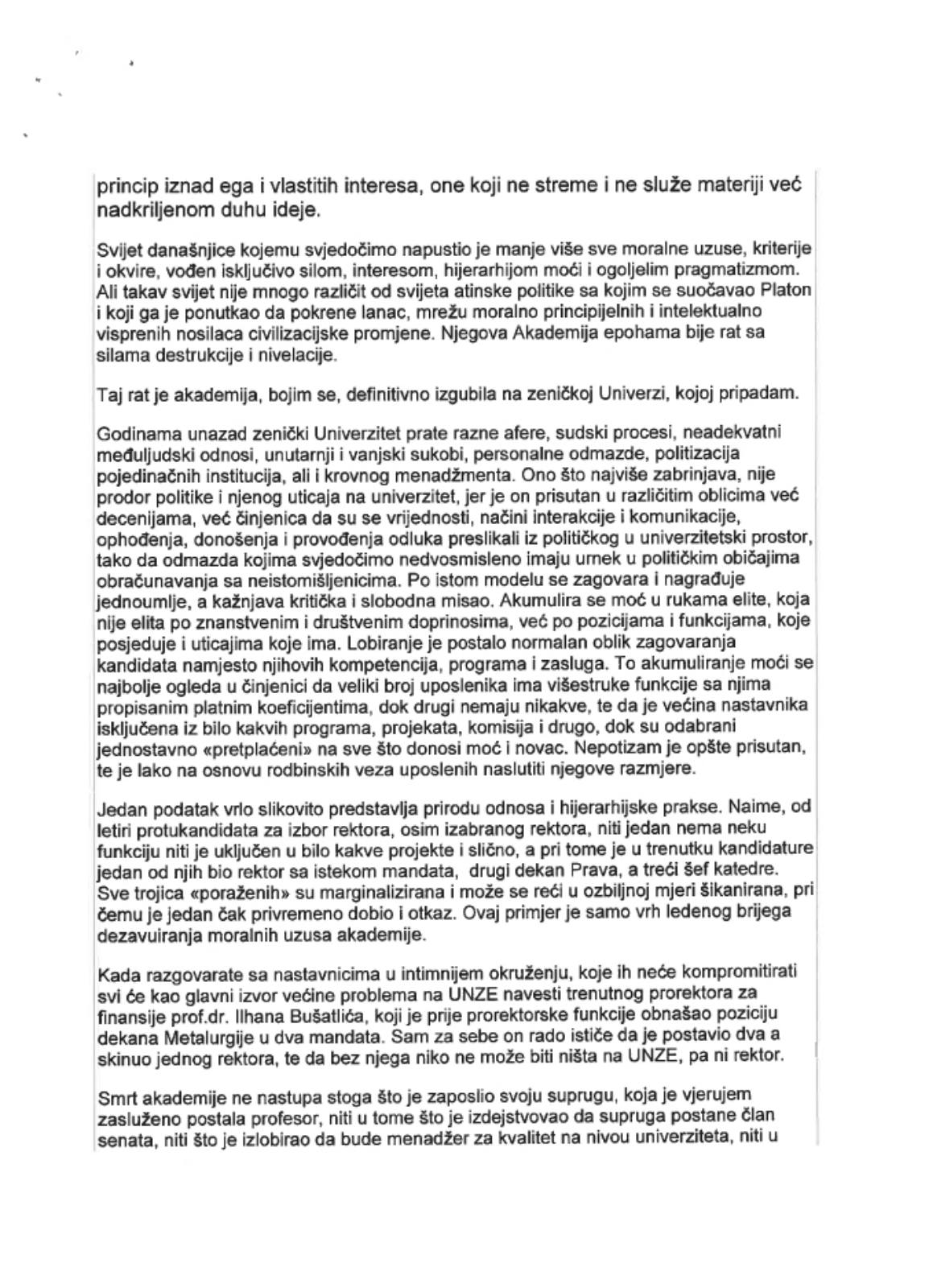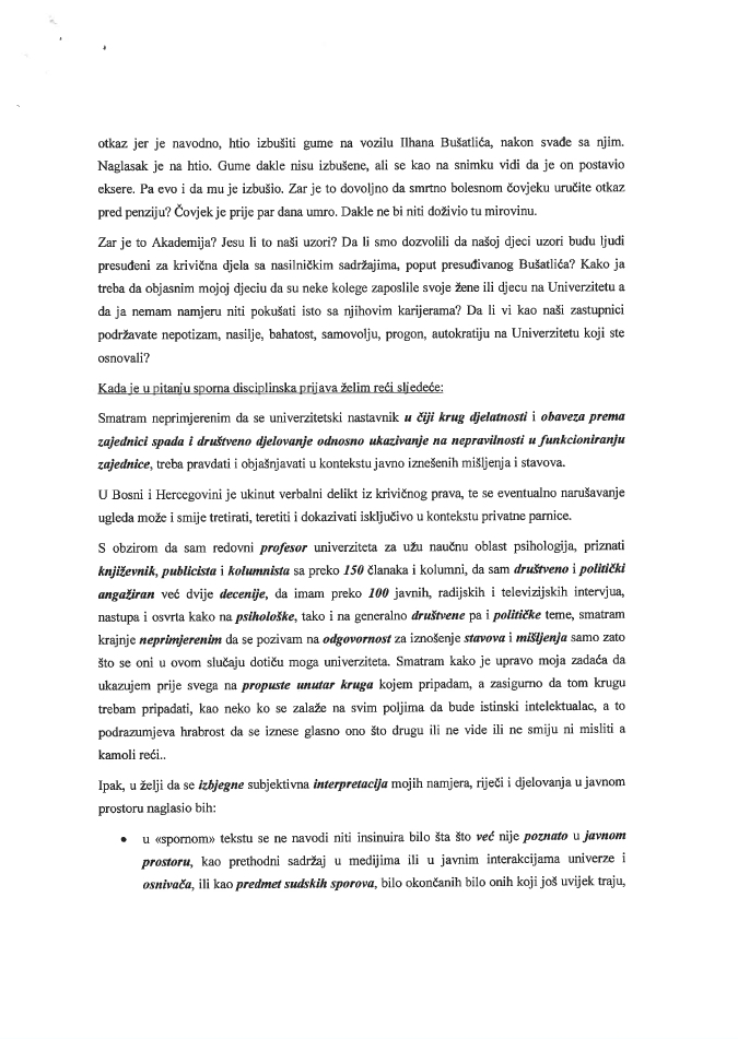 On dalje navodi da mu UNZE i matični fakultet stavljaju na teret da je “na teret da je narušio ugled ove visokoškolske ustanove te “iznio neosnovane činjenice s namjerom narušavanja ugleda i nanošenja štete” kolegi profesoru Ilhanu Bušatliću”.