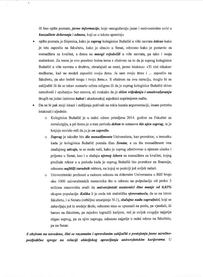 “Opšta je činjenica kako je suprug koleginice Bušatlić u više navrata isticao kako je istu zaposlio na fakultetu, kako je ubacio u Senat, odnosno kako je postavio za menadžera za kvalitet, a čemu su mnogi svjedočili u više navrata, pa tako i moja malenkost. Koleginica Bušatlić je u radni odnos primljena 2014. godine na Fakultet za metalurgiju, a pri čemu je u tom periodu dekan te ustanove bio njen suprug, te je krajnje suvislno reći da ju je on zaposlio. Suprug je također bio dio menadžmenta Univerziteta, kao prorektor, u trenutku kada je kolegtinica Bušatlić postala član Senata, a na šta menadžment ima značajnog uticaja, te se može reći kako je suprug učestvovao u njenom ulasku i prijemu u Senat, kao i u slučaju njenog izbora za menadžera za kvalitet. S obzirom na navedeno, čini se razumnim i opravdanim zaključiti o postojanju jasne uzročno-posljedične spreme na relaciji obiteljskog upravljanja univerzitetskim karijerama”, navodi profesor Skelić.