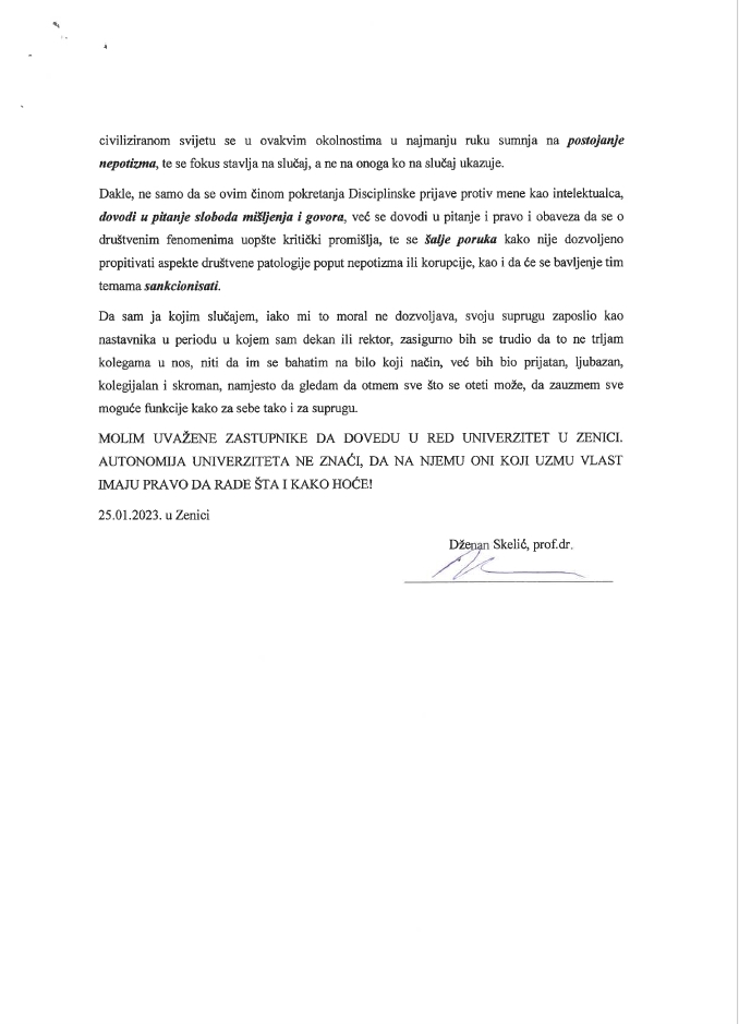 U Pismu Skelić traži od zastupnika reakciju, zaštitu akademskih sloboda, te ih obavještava da je protiv njega Univerzitet u Zenici pokrenuo disciplinski postupak, kako je naveo, zbog teksta u kojem optužuje menadžment za kriminal i nepotizam.