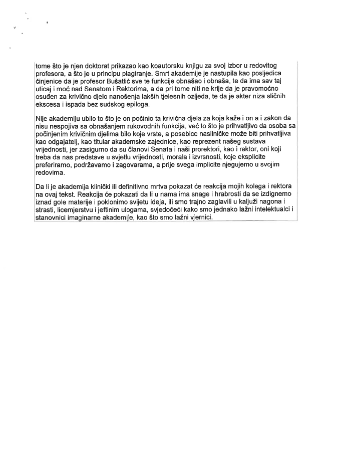 U pismu navodi primjer uručivanja otkaza portiru 18 mjeseci pred penziju, u trećem stadiju karcinoma, jer je navodno htio izbušiti gume na vozilu profesora Bušatlića, nakon verbalnog sukoba. Skelić napominje da se u tekstu objavljenom na portalu Buka niti navodi ni insinuira “bilo šta što već nije poznato u javnom prostoru, kao prethodni sadržaj u medijima ili u javnim interakcijama univerze i osnivača ili kao predmet sudskih sporova”.