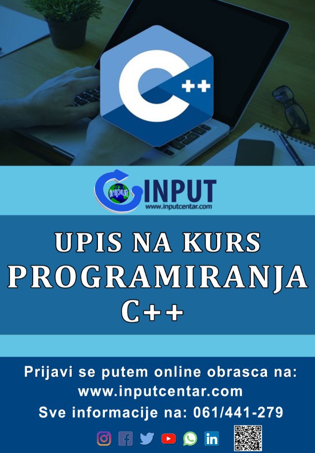 Centar za mlade INPUT kroz svoj dugogodišnji rad i edukaciju iz oblsti IT i uspješno relizovane kurseve i edukacije kroz koje je prošlo oko 14 000 djece, mladih i ostalih zaintersovanih organizuje kurs iz programskog jezika C++