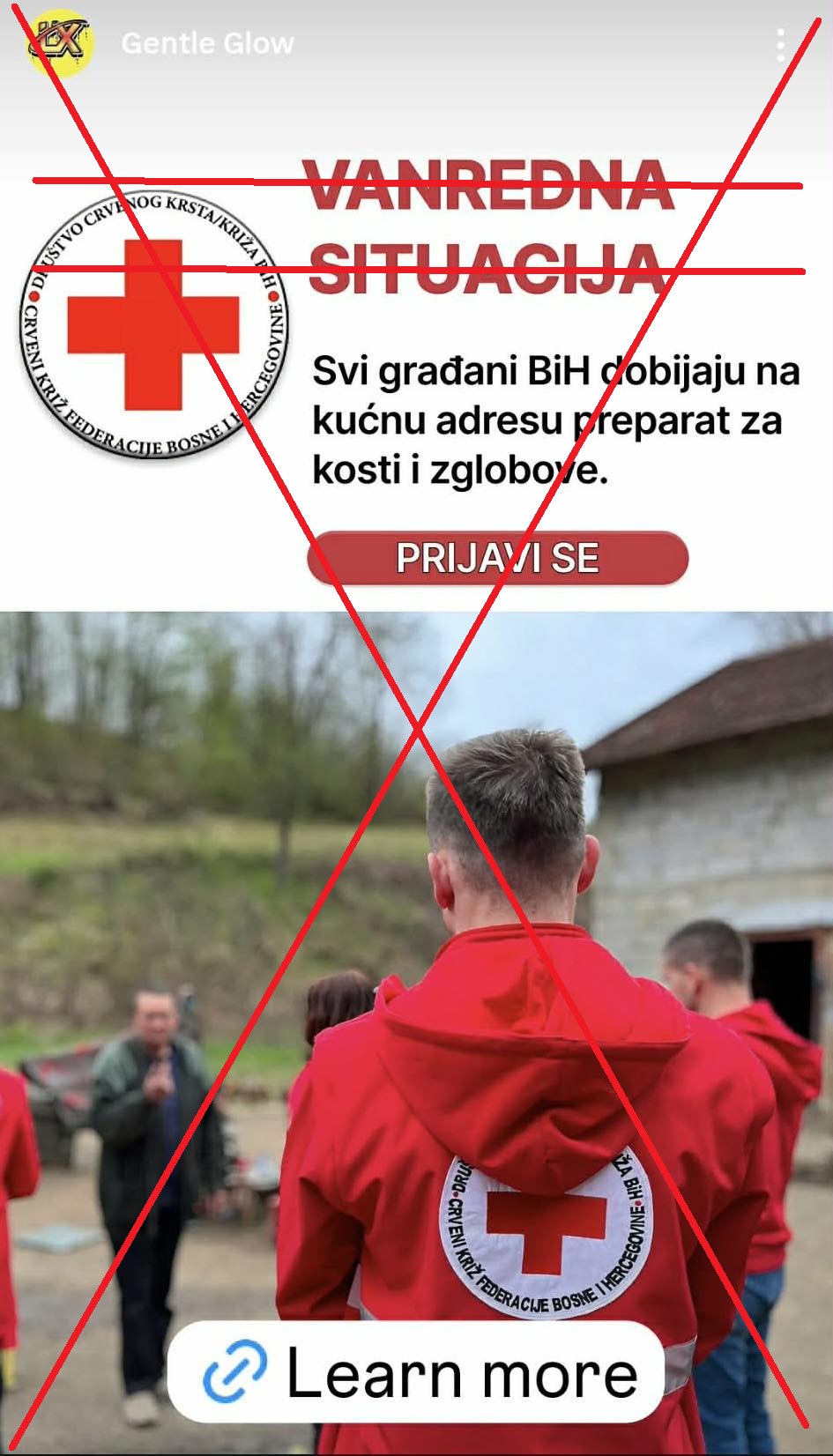 U oglasu se netačno tvrdi da svi građani BiH mogu dobiti preparat za kosti i zglobove na kućnu adresu uz prijavu putem oglasa. Crveni križ Federacije BiH nema nikakve veze sa ovom kampanjom niti distribucijom takvih proizvoda.