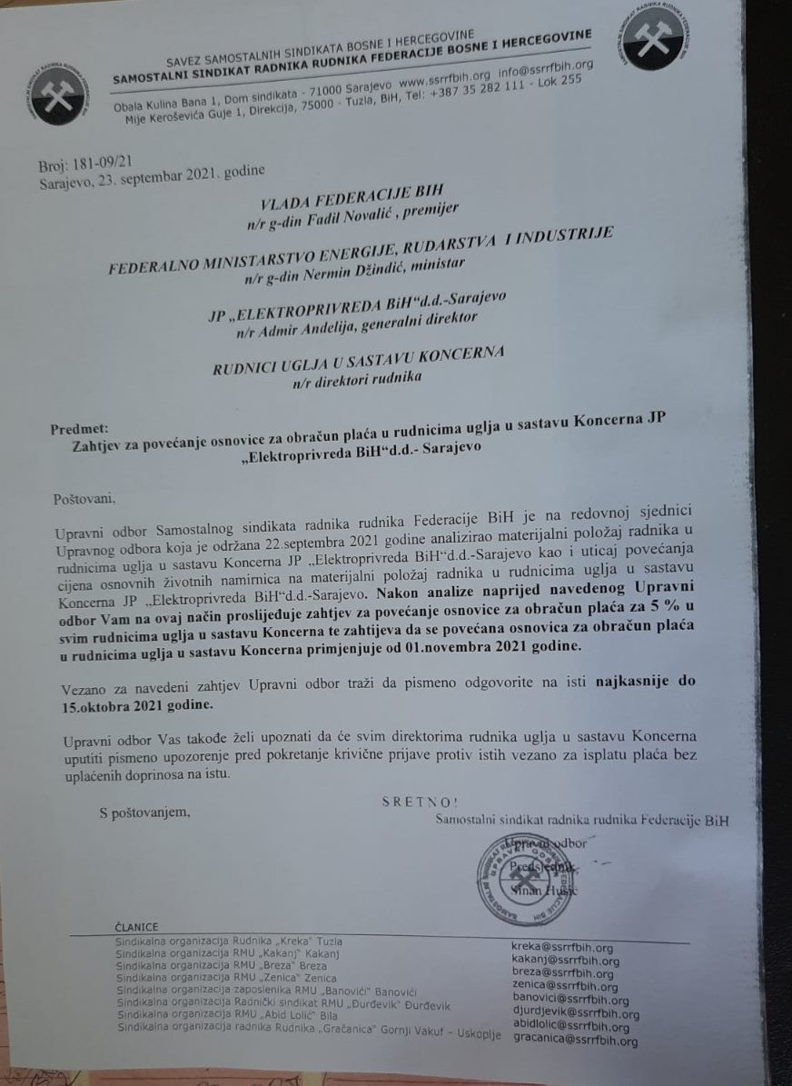 Upravni odbor Samostalnog sindikata radnika rudnika Federacije Bosne i Hercegovine (FBiH), uputio je zahtjev za povećanje plaća za više od 6.700 radnika zaposlenih u rudnicima uglja koji djeluju u sastavu Elektroprivrede BiH.