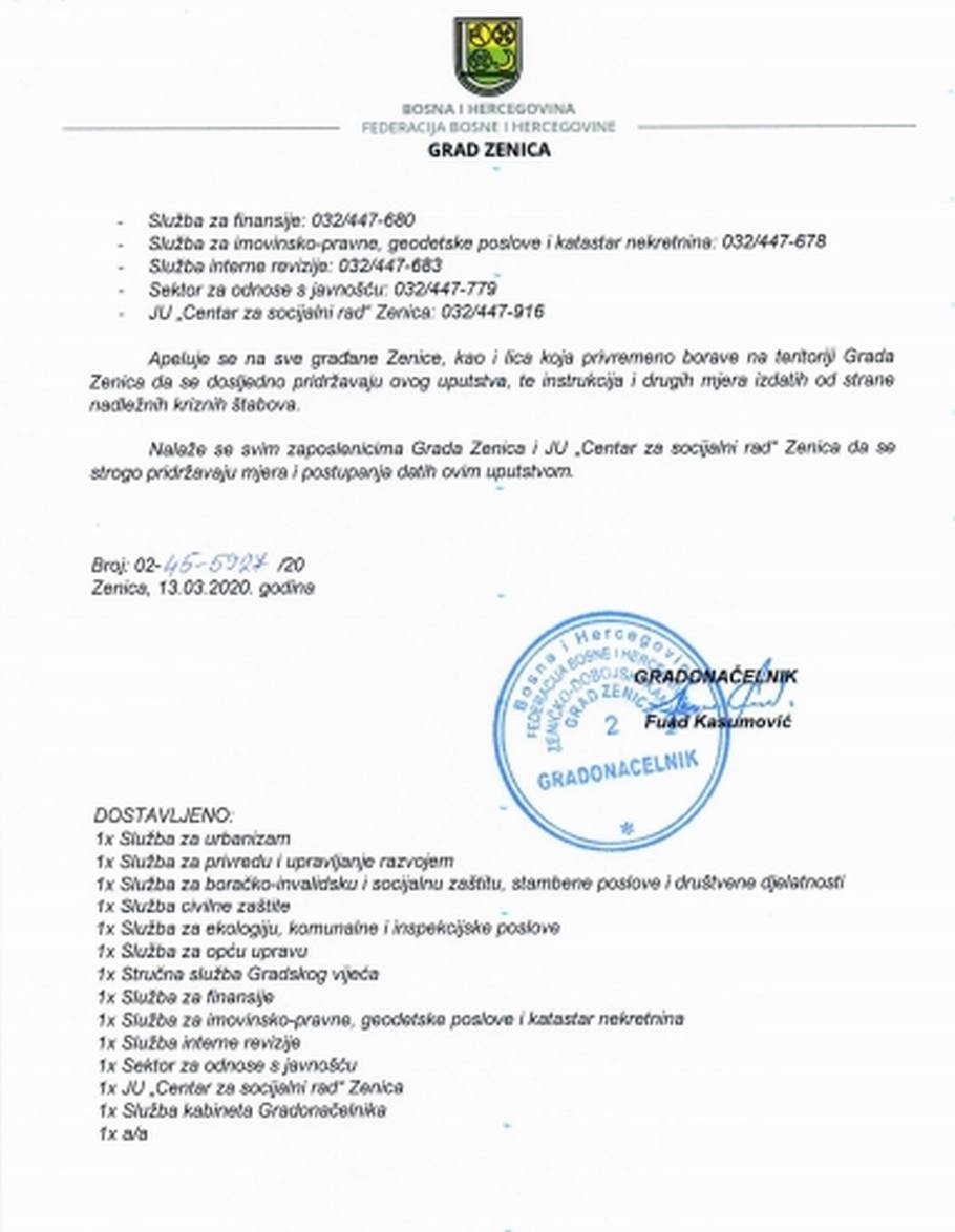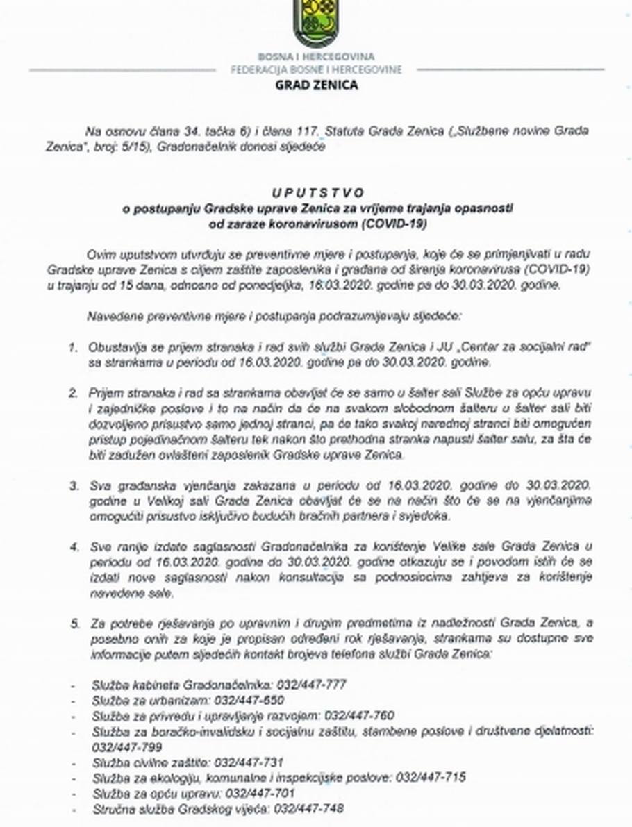 Uputstvo o postupanju Gradske uprave Zenica za vrijeme trajanja opasnosti od zaraze koronavirusom