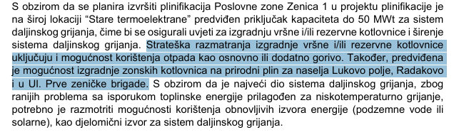 Upravo na stranici 138. Prijedloga, u dijelu koji se odnosi na planove razvoja sistema daljinskog grijanja, navodi se da je u okviru projekta plinifikacije Poslovne zone Zenica 1, na široj lokaciji „Stare termoelektrane“, predviđen priključak snage do 50 MWt za sistem daljinskog grijanja. Time bi se, prema dokumentu, osigurali uslovi za izgradnju vršne i/ili rezervne kotlovnice, kao i dalje širenje sistema daljinskog grijanja.