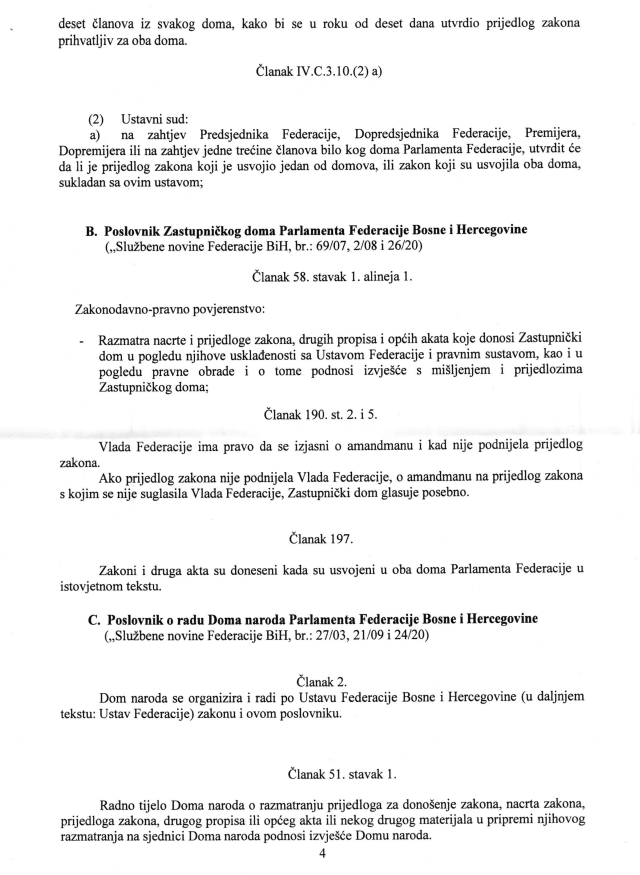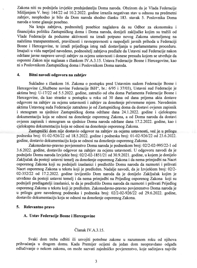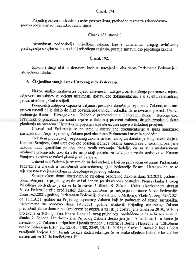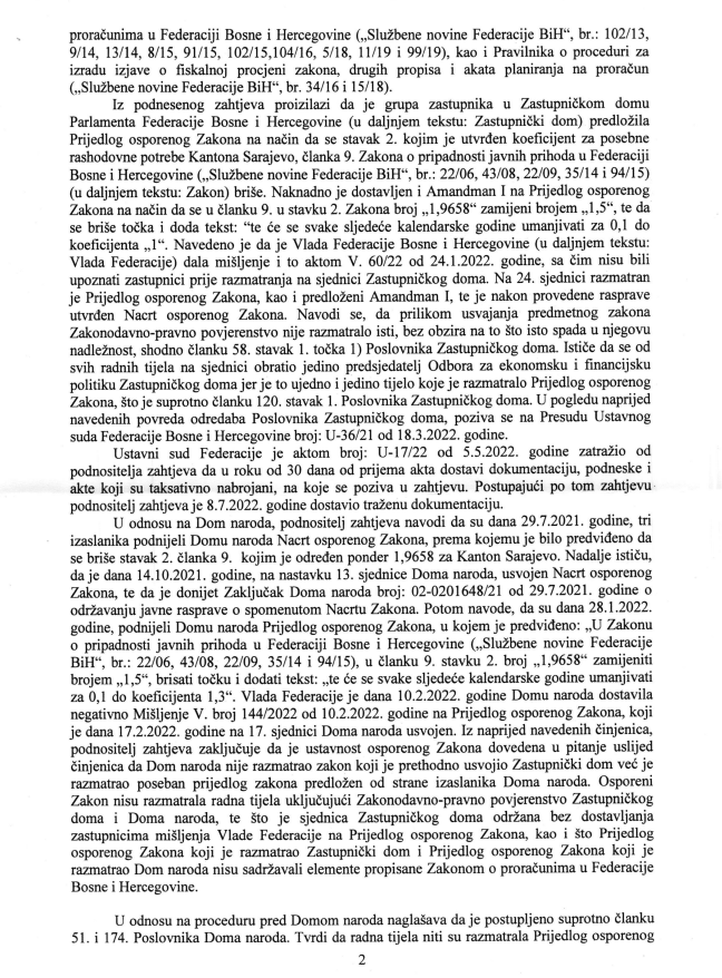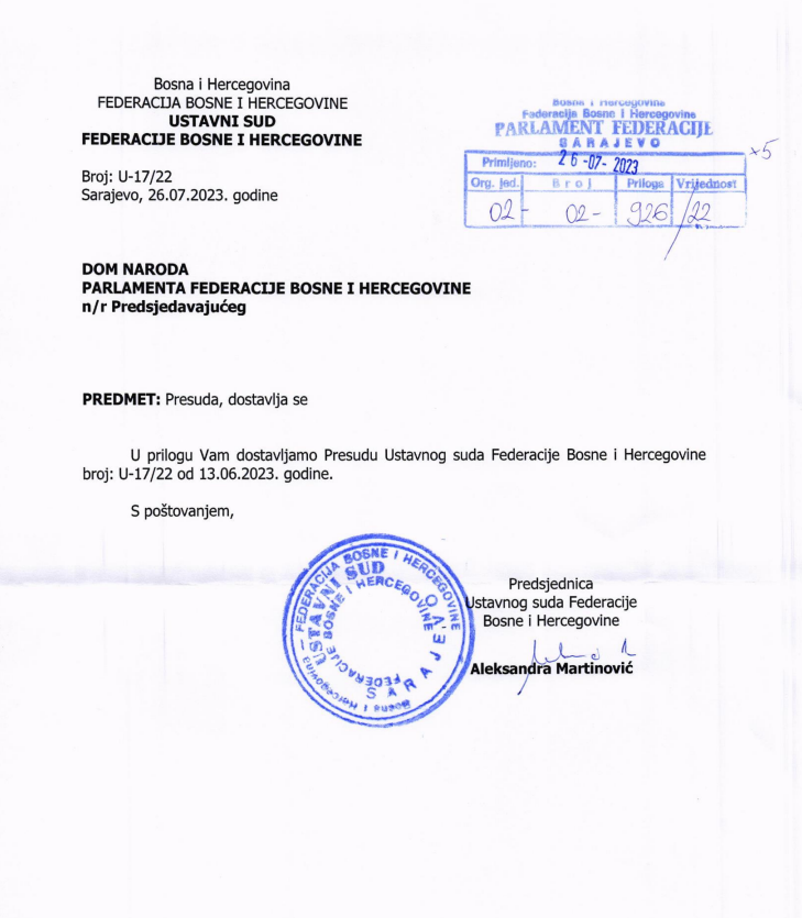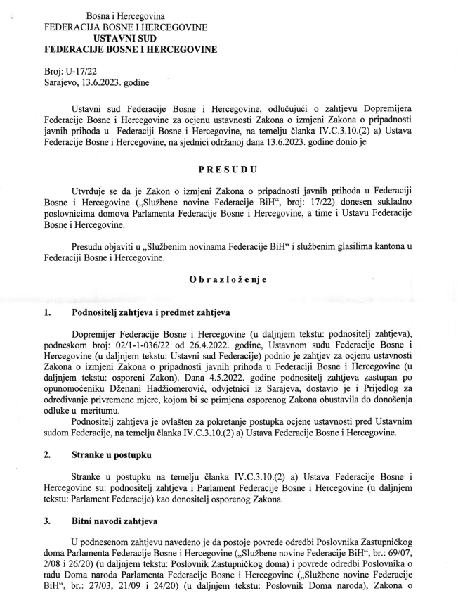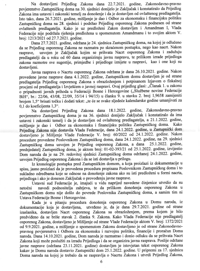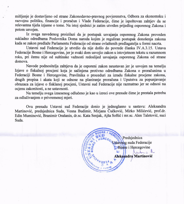 “Iz svega navedenog proizilazi da je postupak usvajanja osporenog Zakona proveden u skladu sa odredbama poslovnika Doma naroda kojim je regulisan postupak donošenja zakona, kada se zakon predlaže Parlamentu Federace od strane ovlaštenih predlagača u formi nacrta” piše u samoj presudi