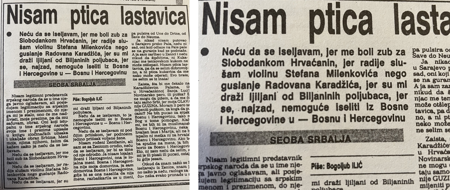 Bogoljub Ilić će u najtežim danima zločina u selu Ahmići kao novinar “Naše riječi” odapeti najubojitiju strelicu kojom će sa nekoliko tekstova historijske vrijednosti odbraniti čast “Naše riječi” I “Radio Zenice” ali i, novinarske profesije uopšte u Zenici.