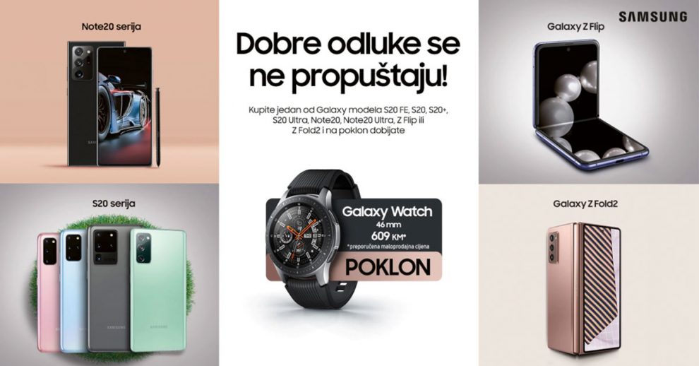 Uz svaki kupljeni Galaxy model S20, Note20, Z Flip, na poklon dobijate Samsung galaxy watch 46 mm. – Nikada nije bilo bolje vrijeme odlučiti se za kupovinu jednog od fenomenalnih Samsung telefona. Ako se odlučite za kupovinu S20 FE, S20, S20+, S20 Ultra, Note20, Note20 Ultra, Z Flip ili Z Fold2 Samsung telefona, na poklon dobijate sjajni Galaxy Watch od 46 mm. Donesite dobru odluku, odaberite telefon koji najviše odgovara vašim potrebama i načinu života te uživajte u poklonu koji će biti njegova sjajna dopuna.