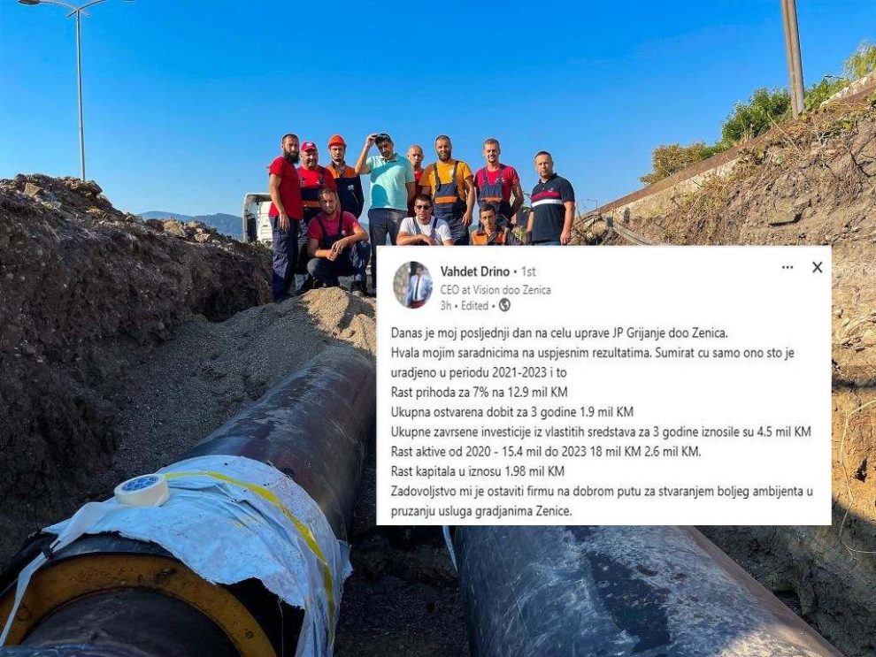 Danas je moj posljednji dan na čelu uprave JP Grijanje doo Zenica, objavio je na društvenim mrežama dosadašnji direktor Javnog preduzeća “Grijanje” Vahdet Drino. Uz “oproštajnu objavu” je objavio i fotografiju sa radnicima ovog preduzeća na nekom od radilišta.
