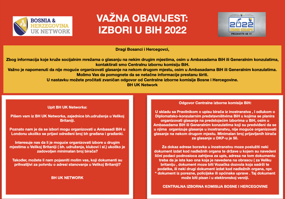 Važno je napomenuti da nije moguće organizovati glasanje na nekom drugom mjestu, osim u Ambasadama BiH ili Generalnim konzulatima.