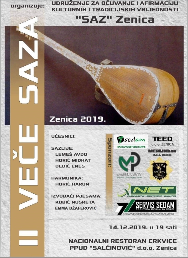 Obavještavamo vas da će se u subotu 14. decembra sa početkom u 19:00 sati u Zenici održati drugo Veče Saza u Zenici, u prostorijama Nacionalnog Restorana Salčinović – Crkvice.