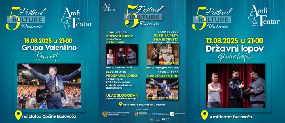 Večeras u Busovači počinje Peti međunarodni Festival kulture, u organizaciji AmfiTeatra, a koji će se održavati od 13. do 16. augusta/kolovoza 2025. godine. Tokom četiri dana trajanja Festivala, publika će imati priliku uživati u raznovrsnom programu namijenjenom svim generacijama.