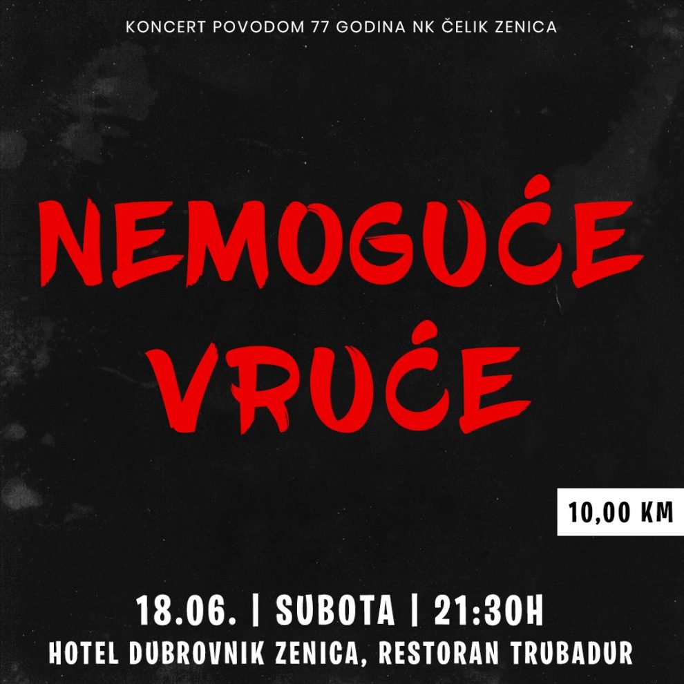 Večeras je sve u pozitivnom duhu zbog koncerta grupe Nemoguće vruće povodom 77 godina postojanja NK Čelik Zenica. Ukoliko ne znate gdje se provesti večeras, povedite vaše prijatelje, porodicu ili dođite sami, jer svi smo mi zajednica, te zajedno pjevajmo i slavimo uz legendarnu grupu iz našeg grada!