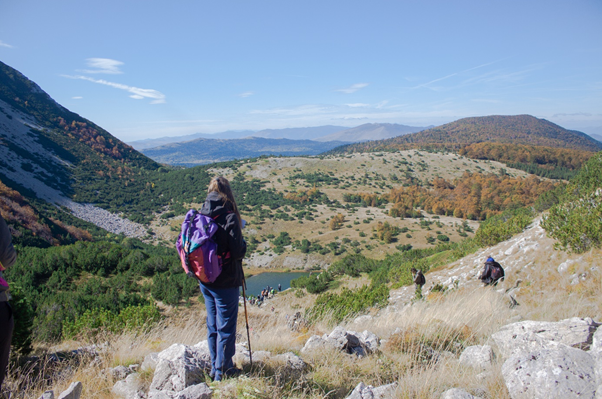 Na lijevoj strani jezera nalazi se staza koja vodi do vrha planine Veliki Šator. Staza je na samom početku strmija, ali kasnije prelazi u blagi nagib do samog vrha. Jesen je ovoj planini dala lijepo ruho, sa smeđim i crvenim bojama. Na sredini puta se nalazi vidikovac sa kojeg se vidi jezero Šator u čitavoj svojoj veličini. Tu smo napravili kratku pauzu za predah i fotografisanje. Potom smo se uputili ka vrhu. Tu nas je dočekao jak vjetar, te smo morali naći zaklon. Svaki vrh ima obilježje, pa i Veliki Šator. Ali ovdje je, umjesto u kamenu tipičnog krša, urađen u mramoru, što je zaista neobično.