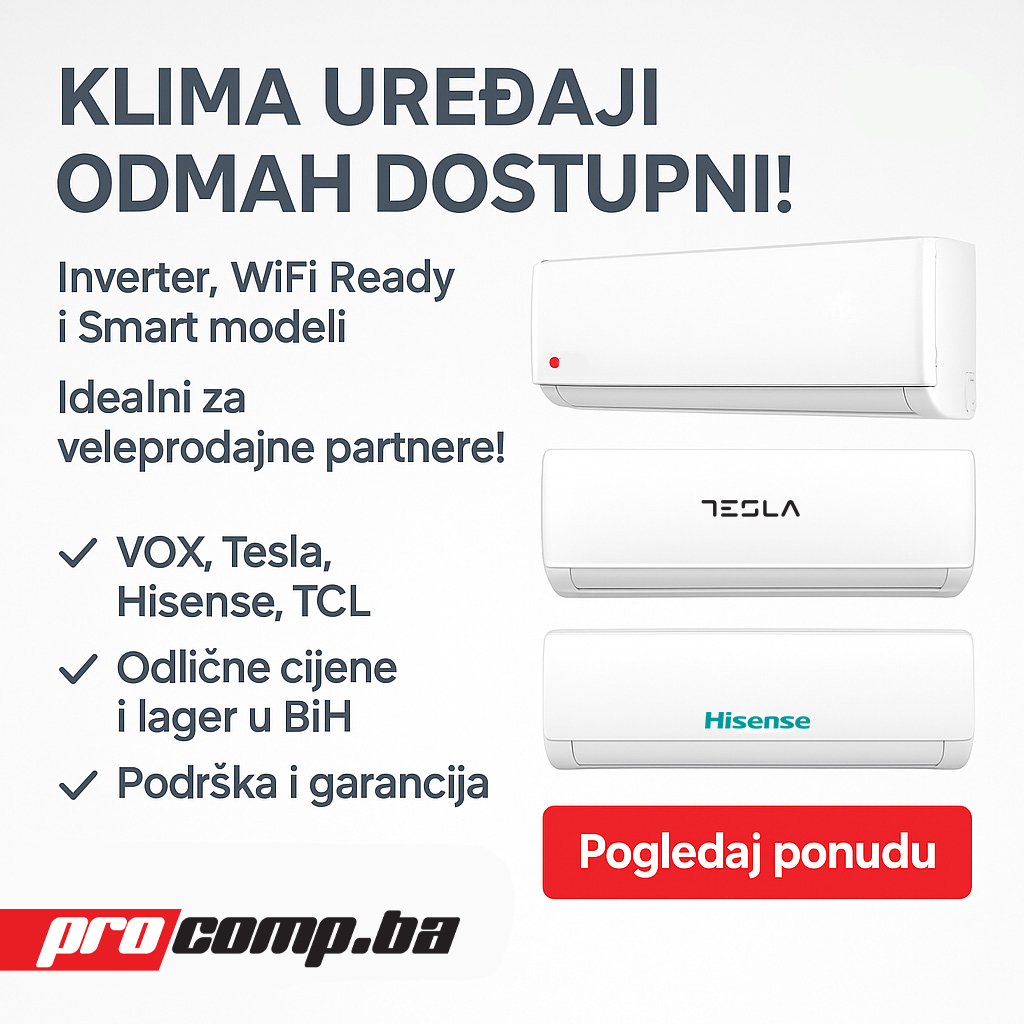 Akcija važi do isteka zaliha, a posebno se ističu modeli iz Gree Cosmo i Hisense Energy serije koji nude odličan omjer cijene i performansi. Cijeli asortiman dostupan je za pregled i kupovinu online, ali i direktno u ProComp poslovnici u Zenici (Srpska mahala 45), gdje posjetitelji mogu dobiti i stručne savjete prilikom izbora idealnog uređaja.