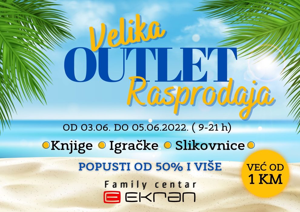 U Family centru Ekran, ovog vikenda pripremamo veliku outlet rasprodaju sa sniženjima 50% i više. Veliki izbor slikovnica i igračaka potražite već od 1 KM, a knjige već od 2KM.